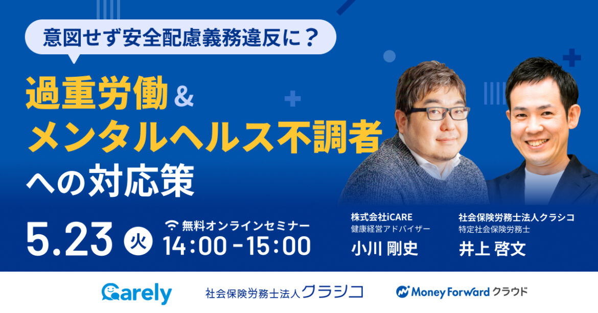 | 開催日時:2023年05月23日(火)14:00~15:00 場所:オンライン(Zoom) 料金:無料 開催概要: 昨今、働き方改革等による隠れ残業の常態化や、テレワーク実施企業の増加などにより、 「従業員が過重労働をしていたが、企業がそれを把握できていなかった」という事態が起こりやすくなっております。 もしメンタルヘルス不調が発生した場合、企業は安全配慮義務違反に問われる可能性があります。 このような場合、企業はどのような対策を講じればよいのでしょうか? 本セミナーでは、過重労働とメンタルヘルス不調への対策を、労務管理・健康管理それぞれの視点から事例を交えお伝えいたします。 |
