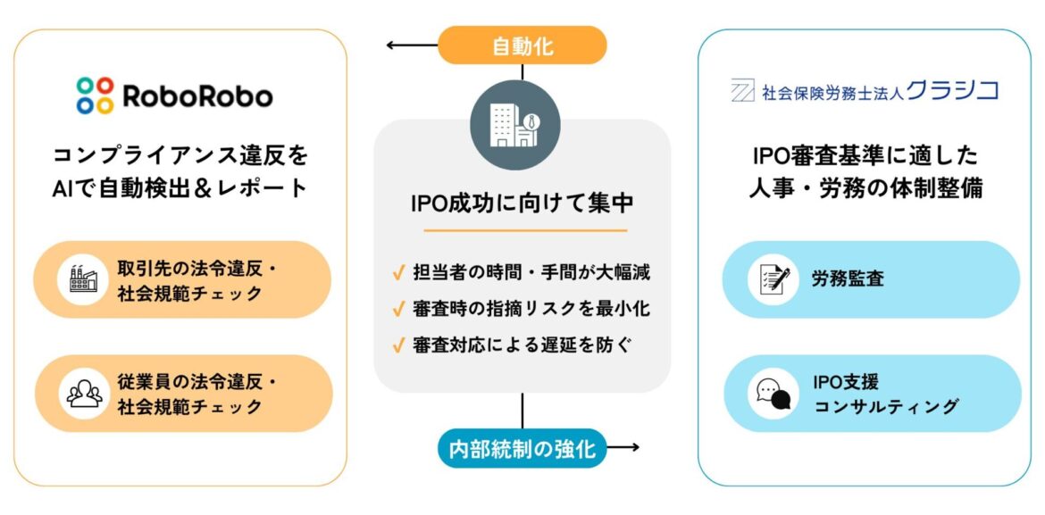 ■プレスリリース配信(2025年2月28日 PRTIMES) AI活用でIPO支援をスピードアップ。社会保険労務士法人クラシコ、コンプライアンスチェック自動化サービス「RoboRobo」と業務提携 https://prtimes.jp/main/html/rd/p/000000005.000061178.html ■関連サイト RoboRoboコンプライアンスチェック│オープン株式会社 労務監査サービス │社会保険労務士法人クラシコ IPO支援│社会保険労務士法人クラシコ |