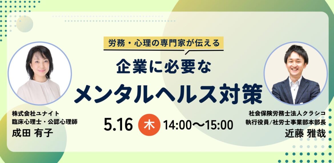 【5月16日開催】労務・心理の専門家が伝える!企業に必要なメンタルヘルス対策