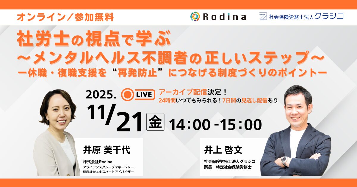 本ウェビナーでは、復職支援の現場を支援してきた株式会社Rodinaと、人事労務の法的整備を支援する社会保険労務士法人クラシコが登壇。